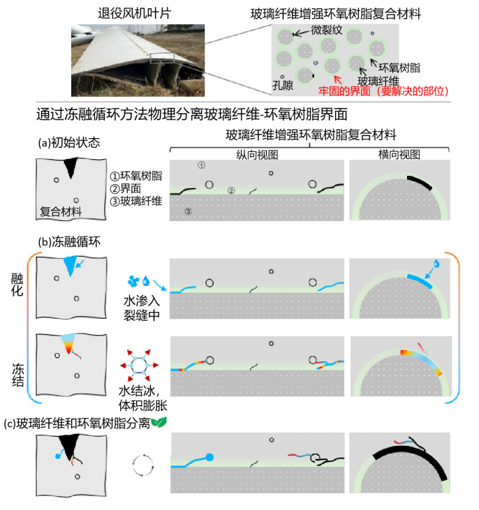 该研究针对风电领域即将面临的规模巨大的退役风机叶片有效回收难题,提出了一种新型环境友好的基于冻融循环的纤维-树脂分离方法,与国家“双碳”战略目标高度契合。