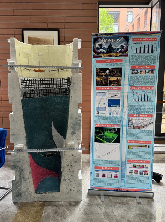 在近一年的备赛周期里,队员们从理论分析与实验测试入手,逐步确定了船体材料配比与船型方案,并先后完成了机械臂切模、预应力钢绞线布置、养护装置搭建以及船体后期打磨等关键施工环节。比赛现场,队员们凭借扎实的学术功底与流畅的答辩表现,以绝对优势摘得赛区混凝土轻舟项目总分第一名,同时包揽了所有分项的第一名。