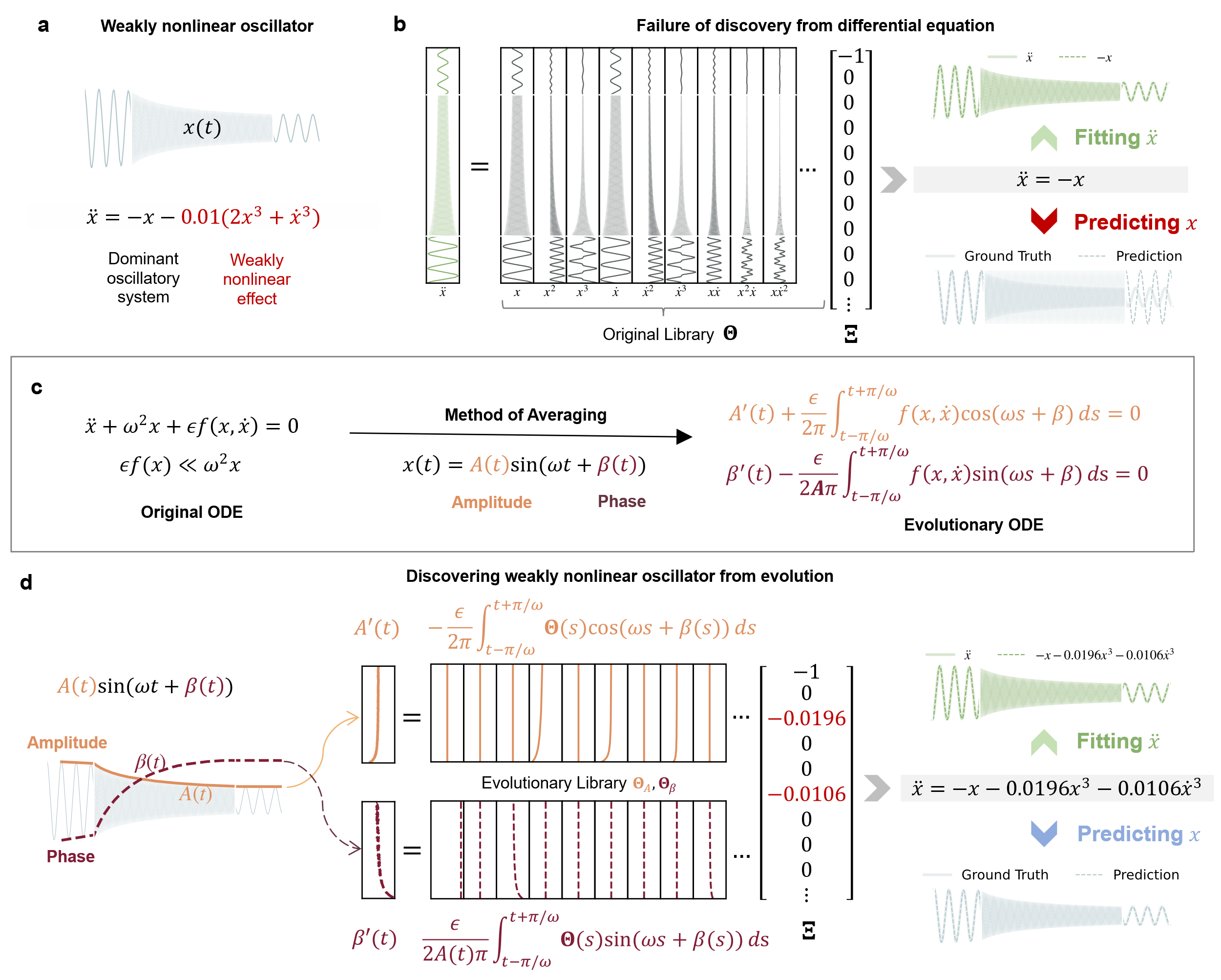 图3. EvLOWN 核心思想:传统数据驱动模型拟合微分方程,会自然地忽略了系数显著较小的弱非线性项。因此,得到的模型无法捕捉到长期演化;EvLOWN重新定义了弱非线性振子的识别目标,通过识别慢速演化(振幅、相位)的控制方程以成功识别弱非线性项,从而实现对系统行为的精确重构和可靠的长期预测。