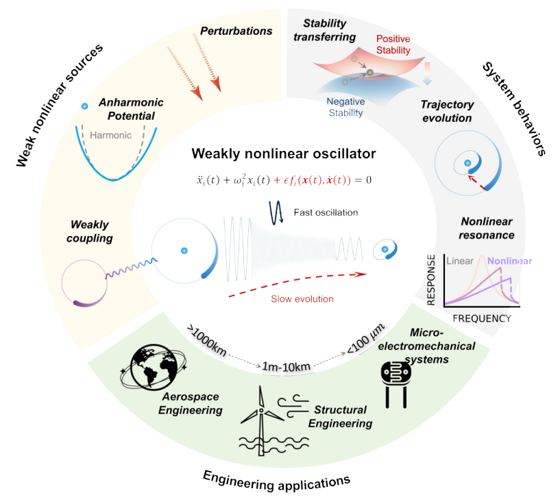 图2. 弱非线性振子的现实问题原型:弱非线性振子遍布各个尺度的工程,航空航天-结构工程-微系统器件;而弱非线性决定了现代工程系统运行安全和系统故障之间的界限。对这些效应的错误描述会导致定量预测(长期轨迹漂移)和系统性质(稳定性、共振响应)出现严重误差。