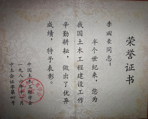 奖状奖章编号:14 奖状奖章名称:中国土木工程学会荣誉证书 获奖人员:李国豪 备 注: